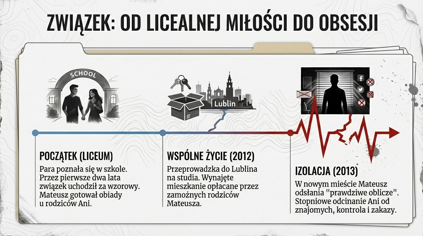 Problemy zaczęły się po wspólnej przeprowadzce do Lublina w 2012 roku. Mateusz, który nie dostał się na wymarzoną medycynę, zaczął wyładowywać frustrację na partnerce. Jego zachowanie ewoluowało od zaborczości do fizycznej i psychicznej przemocy. Matka ofiary zauważała siniaki i wybroczyny na szyi córki, a sam Mateusz wprost komunikował, że dziewczyna jest "jego własnością".