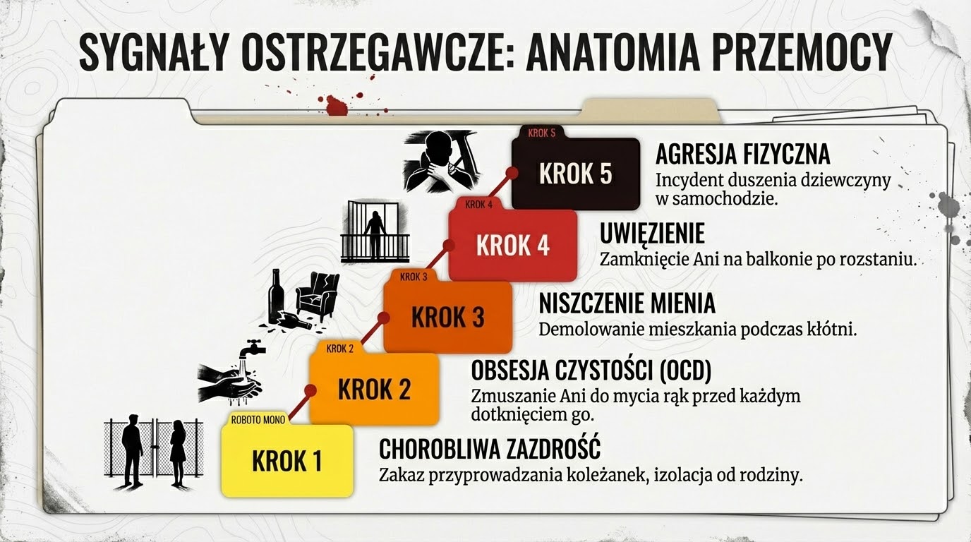 Mateusz miał obsesję na punkcie brudu. Kazał Ani myć ręce, zanim pozwolił się jej dotknąć. To rzadki, ale groźny sygnał – fobia stała się narzędziem tresury.
