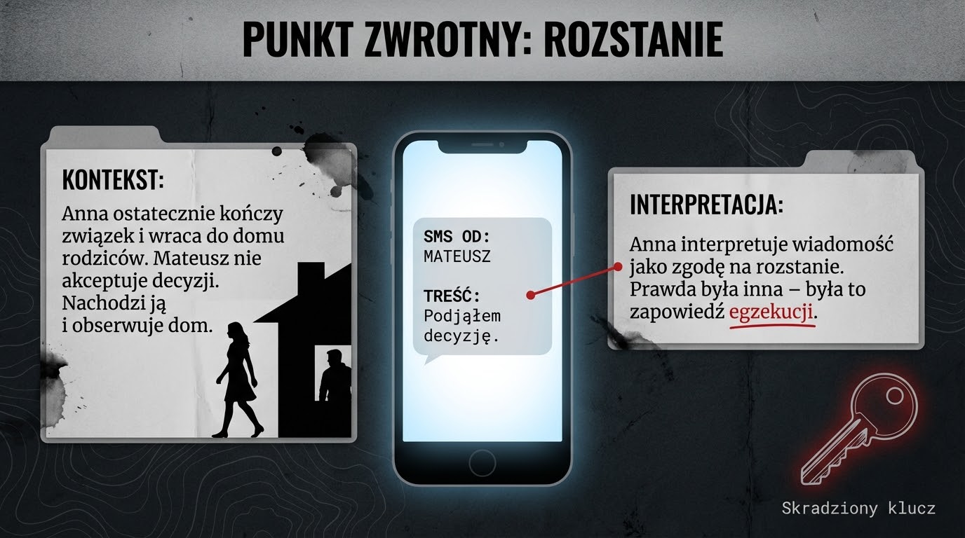 Gdy Anna postanowiła ostatecznie zakończyć związek, Mateusz wpadł w szał. Zamknął ją na balkonie, szarpał i groził. Mimo powrotu dziewczyny do domu rodzinnego, sprawca nie odpuścił. Obserwował jej dom i wysyłał niepokojące wiadomości, w tym SMS o treści: "podjąłem decyzję".